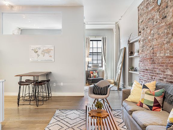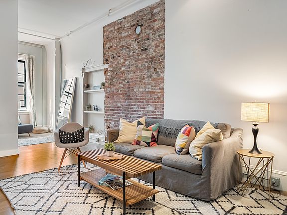 The bedroom retreat is highlighted by dramatic brickwork and tall windows, offering a private yet airy escape. A stylish bath with granite vanity and glass shower rounds out the home's thoughtful design.