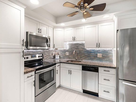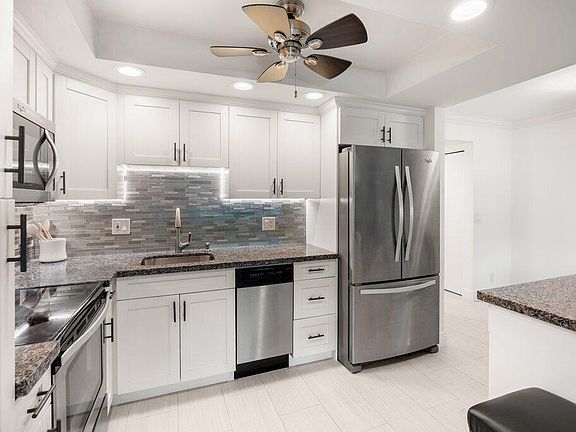 This beautifully updated 1-bedroom, 1.5-bathroom condo (55+) is move-in ready and packed with upgrades. Step into a bright, open kitchen featuring white cabinets, granite countertops, a stylish tile backsplash, recessed lighting, stainless steel appliances, and an island perfect for entertaining.Throughout the home, you'll find detailing such as crown molding, smooth ceilings, and ceramic tile floors that enhance the light and airy feel. The bathrooms have been tastefully updated with modern tile, recessed lighting, and a sleek glass-enclosed shower, & more.Just steps from the pool and East Gate, and minutes to beaches, shopping, and dining.Resort living at Century Village includes a theater, gym, indoor & outdoor pools, pickleball, tennis, & more!