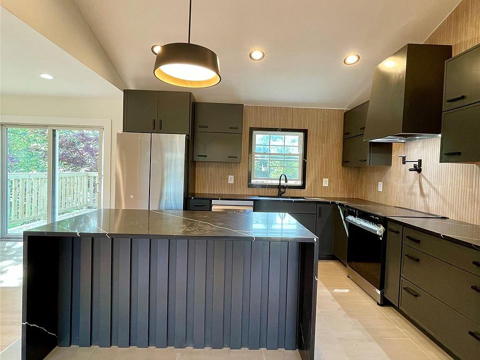 Modern chandelierGarage doorNew roofRecessed lightingSamsung stainless steel appliancesNew doorsHigh end fixtures