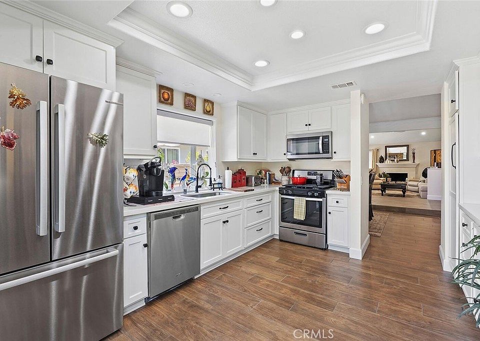 Welcome to 10 Glenhurst! This beautifully updated single-story end-unit is located in the highly desirable Woodbridge community. With an open floor plan, this home features 2 spacious bedrooms, 2 full bathrooms, and a convenient 2-car direct-access garage. A charming double door entry opens to a welcoming foyer featuring porcelain matte wood-look flooring laid in an elegant herringbone design, setting the tone for the stylish updates found throughout the home. The flooring continues through the main living areas, offering durability and modern appeal, while the bedrooms are finished with new plush carpet for added comfort. The living room is bright and airy, enhanced by vaulted ceilings and a tile-accented fireplace that adds warmth and charm. The separate dining area flows seamlessly into the kitchen, which includes updated stainless steel appliances, beautiful new countertops, and recessed lighting. A sliding glass door leads to the spacious patio with newly redesigned combination of concrete hardscape and softscape featuring artificial turf and natural stone wrapped planters filled with trees and shrubs to create an outdoor space that strikes as the perfect balance between greenery and function. Whether you're hosting friends, dining al fresco, or simply relaxing under the sun, this inviting and private patio offers an ideal setting for both entertaining and everyday enjoyment. The remodeled primary suite features a walk-in closet, dual quartz vanities, and a walk-in shower. The secondary bedroom includes mirrored closet doors. The remodeled hallway bathroom offers a soaking tub with glass doors and a quartz vanity. Additional highlights include rebuilt HVAC system, new ductwork and new insulation in the attic. fresh interior paint, smooth ceilings, overhead storage space in the garage with a pull-down ladder and numerous other thoughtful updates throughout. Located within the award-winning Irvine Unified School District, the home also includes access to Woodbridge’s resort-style amenities—lakes, pools, splash pads, tennis courts, parks, clubhouses, boating, fishing, and more. Fallbrook Park, with its popular splash pad, is just a block away. Enjoy comfort, style, and community in one of Irvine’s most beloved neighborhoods.