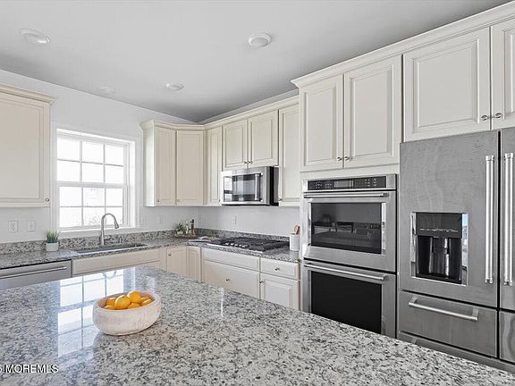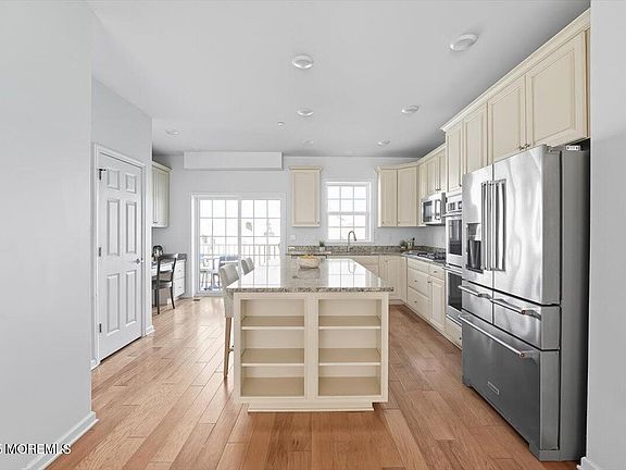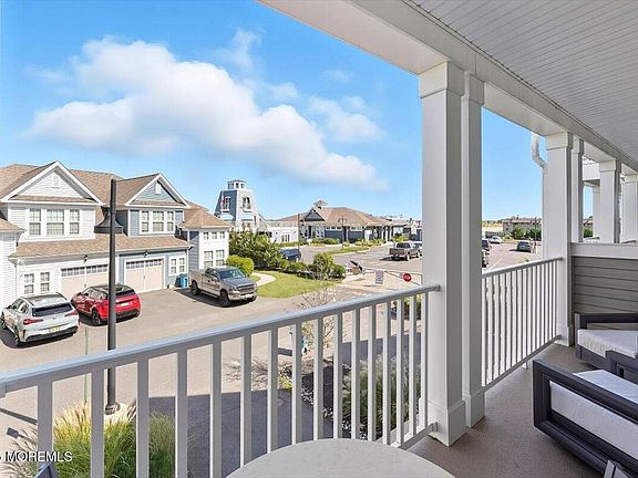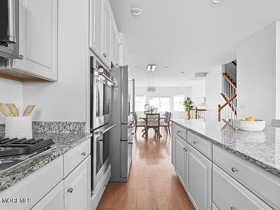 Experience premier coastal living in this upgraded 3BR, 3.5BA Harborside townhome with 4 private decks and sweeping Sandy Hook Bay views. The master suite offers vaulted ceilings, a private balcony, custom walk-in closet, and spa-like bath. Owners enhanced the home with a custom laundry room, pantry, built-in desk, garage storage, EV charger, and smart motorized shades. The open-concept main level boasts a chef's kitchen with granite island, stainless appliances, and seamless flow to a covered balcony. Flexible living includes a guest suite/office with patio access plus three home office spaces across three levels. Outdoor upgrades include an enclosed deck underside for comfort. Steps to Seastreak Ferry, Henry Hudson Trail, beaches, dining, and marina—this is Shore living at its best. The main level showcases an open-concept design with a chef's kitchen boasting a granite island, stainless steel appliances, and abundant cabinetry. Enhancements include a custom pantry and a built-in desk with extra cabinetry, perfect for modern living. The dining area and expansive family room flow seamlessly to a covered balcony with breathtaking water views.
