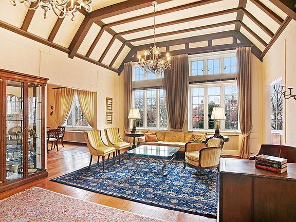 Overlooking Holder Place, this sprawling, prewar residence is a beautifully proportioned classic 6 1/2 room home in the most desirable building in Forest Hills Gardens. Each room offers a perfect flow of space for comfortable family living. A 9 x 4'6 foyer leads to an impressive living room with 14ft high beamed ceiling,WBFP,South facing double height windows letting full sun streaming into the home all day.On the western side of the living room is a sunny Alcove space, ideal for office or sitting room. Three split bedrooms are spacious and have en-suite-bathrooms.A gracious dining room has 10ft ceiling. The windowed kitchen faces East.There are excellent closets throughout,as well as a separate storage room in the basement at no extra charge.