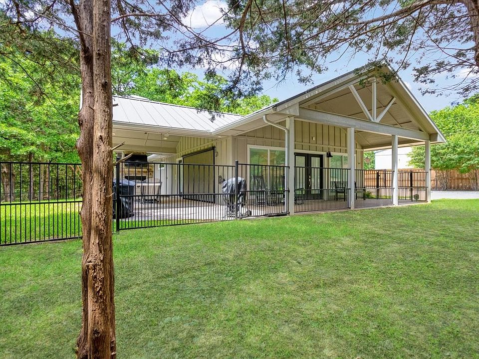 Tucked away in the woods and just a short walk, or scenic golf cart ride, to one of Lake Texoma’s best-kept secret beaches. This stunning custom lake home is your perfect private escape. A circle drive welcomes you into the property, with a power gate. The 8 foot privacy fence stretches along the street for even more privacy.