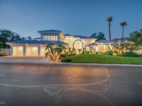 Step behind the prestigious second gate to this rare Mediterranean estate on a premier south-facing corner lot with 4-car garage. Soaring 24-ft ceilings with cathedral windows frame lush backyard landscaping, a 45-ft pool, and cascading waterfall. Grand living and dining spaces, library, and private aviary. Entertain effortlessly in the family room, media/game room with full bar, and resort-style backyard with spa. Two ensuite bedrooms downstairs; expansive primary suite with fireplace, wet bar, dual baths, steam shower, soaking tub, and dual walk-in closets. Office/loft, workout room, and sun-filled yoga room with sweeping valley views. Prime location in prestigious Spanish Trail with 27-hole golf, minutes from Summerlin and the Las Vegas Strip, offering premier country club lifestyle and unmatched security in one of Las Vegas’ most sought-after neighborhooods.