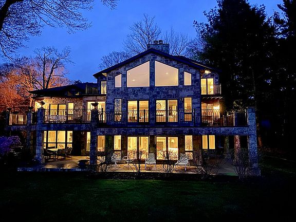 LAKE FRONT. This home has the sought after "long view" of the lake. IMPORTANT: SE exposure with sunshine until sunset. Lakefront homes on the West side of the lake are "dark" by 4pm even in Summer. 5,732 sf of living space. 3 stone fireplaces. Walk out finished ground level with "Summer kitchen" and entertainment area. 2000 sf of outdoor decking directly facing Pines Lake. Cantilevered steel beam dock (12' x 32') 125 ' custom stone bulkhead. Private beach area. Extensive expanses of glass on all levels of the residence's elevation bring lake panoramas into most rooms. Frame construction; new "Camelot" asphalt roof, 5 zone gas fired hot water baseboard heat. 4 zone AC. 400 amp electric service. Heated paver driveway and walkway for easy snow removal. Custom features throughout. Amazing year round lakefront living, boating, sailing, fishing, swim, and tennis.