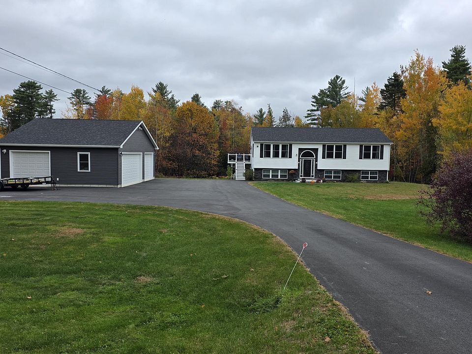 The kitchen boasts granite countertops and new appliances installed in 2020. Additional updates include heat pumps installed in 2020, new windows and flooring from 2020, a 30x36 four-car garage built in 2023, a new roof and paved driveway completed in 2024, and a new shed added in 2024 for extra storage.