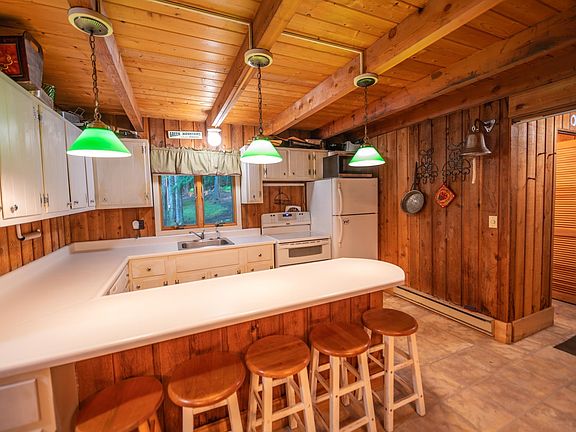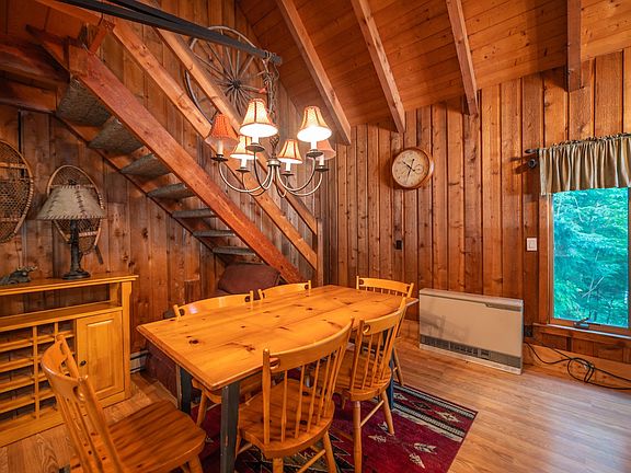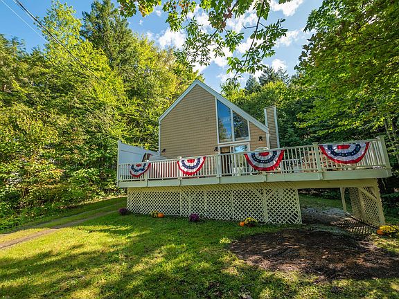 Charming rustic chalet located just off the back side of the Haystack Golf Course with direct snowmobile trail access, nearby village and lake access, and just a short drive to the Mount Snow ski resort. Located on a quiet cul de sac with convenient public water and sewer, this home sits on a private lot with nice sunny exposure and ample parking. Inside is a vaulted great room with natural wood paneling throughout, for a great Vermont look. There is a large living space with wood burning fireplace, open concept kitchen with breakfast bar and adjacent dining space, main floor bedroom and full bath, large mudroom gear storage area and laundry room, 3 guest bedrooms upstairs with vaulted ceilings and another full bath, and an additional loft space ideal for overflow sleeping or second sitting area. There is also a large deck for entertaining with hot tub, a full basement with exterior access great for storage, and a trash disposal area for the community. A great amount of space for a fraction of typical pricing.