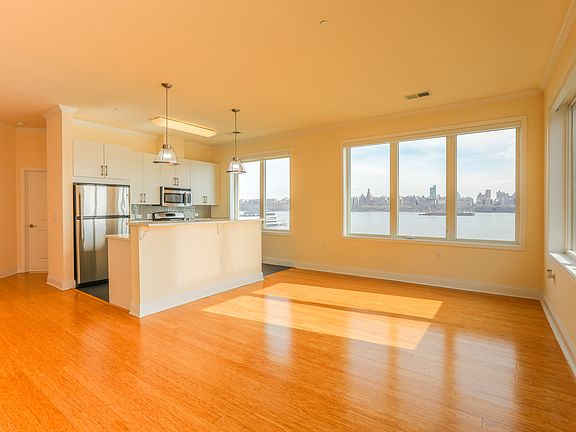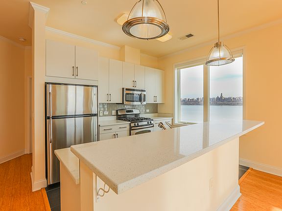 Experience luxury living in this beautifully appointed waterfront apartment featuring spacious interiors and breathtaking views of the Hudson River and New York City skyline. The open-concept layout includes an updated kitchen that flows seamlessly into a large living area, perfect for entertaining or relaxing.