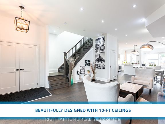 Welcome to 10 Marshall Blvd, a stunning 4-bedroom, 3-bath detached home nestled in the heart of Toronto's vibrant Mount Dennis Rockcliffe-Smythe community. This recently built gem offers a perfect blend of modern elegance and family-friendly comfort, spanning over 2,500 sq ft, inclusive of all three floors. Step inside to soaring 10-ft ceilings on the main floor, where natural light pours through oversized windows, illuminating rich hardwood floors and a striking open layout. The chef's kitchen is a showstopper-complete with a quartz island, three-level stacked cabinetry reaching the 10-foot ceilings, and a vast breakfast bar perfect for casual mornings or evening entertaining. Step upstairs and enjoy 9-ft ceilings over four spacious bedrooms, including a luxurious primary suite with a spa-inspired 5-piece ensuite and custom walk-in closet. The fully finished basement offers a separate entrance, dedicated laundry room, laminate flooring and LED lighting, just perfect for extended family or rental potential. Outside, a private backyard patio to enjoy weekend family breakfasts again, then host weekend BBQs and quiet relaxation evenings. Located in a peaceful, family-oriented neighbourhood, 10 Marshall Blvd is ideal for an active lifestyle, just minutes from the Humber River trails, Tennis Parks, and Lambton Golf & Country Club. Families will appreciate proximity to top-rated schools (including Francophone), visit community centres, and playgrounds. Commuters benefit from easy access to TTC, the recently opened Mount Dennis LRT - GO/UP Express, and major highways. Enjoy nearby shopping at Stockyards District, local cafés, and diverse dining options that reflect the area's multicultural charm. This is more than a home-it's a lifestyle. Whether you're raising a family, working remotely, or entertaining guests, 10 Marshall Blvd offers the space, style, and location for your family to grow and celebrate life's moments.