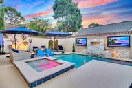 Heated salt water poolLedger tile fireplaceOutdoor gas fireplaceOne level livingGas heaterStainless steel appliancesVaulted ceiling