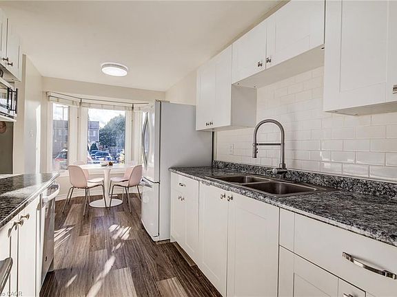Tucked within a quiet, well-managed condo community, this updated townhome offers comfort, style, and over 1,600 sq. ft. of finished living space. Step inside to find a bright, carpet-free home featuring brand new vinyl flooring and freshly painted walls, all completed this year.The galley kitchen features a classic subway tile backsplash and a sunny eat-in area framed by a south-west facing bay window. The spacious living room flows naturally to the back deck through sliding doors, where you can relax among mature trees and enjoy views of D’Moura Tract Park. Upstairs, you’ll find three bright, comfortable bedrooms. The primary bedroom is tucked at the back of the home, offering a peaceful retreat at the end of the day. A refreshed 4-piece family bathroom completes the upper level. The finished basement adds even more versatility with a large rec room, ideal for movie nights, a home office, or a gym, plus an updated 2-piece bath, a laundry area with LG washer and dryer, and plenty of storage. Parking is easy with your assigned space right out front. Fantastic schools are within walking distance. Enjoy a wide range of amenities along Hespeler Road, including shopping, dining, and everyday conveniences. Just a five minute drive away lies historic downtown Galt, known for its charming shops, cafes, and restaurants. Commuting is easy with quick access to Highway 401. Outdoor enthusiasts will appreciate the abundance of nearby parks, from Shade’s Mills Conservation Area, ideal for swimming, fishing, picnicking, snowshoeing, and ice fishing, to Soper Park, which offers a playground, splash pad, disc golf, and a lovely setting with mature trees and babbling brook.