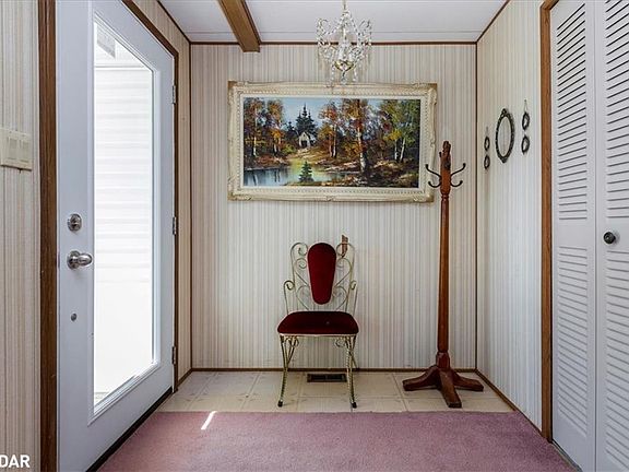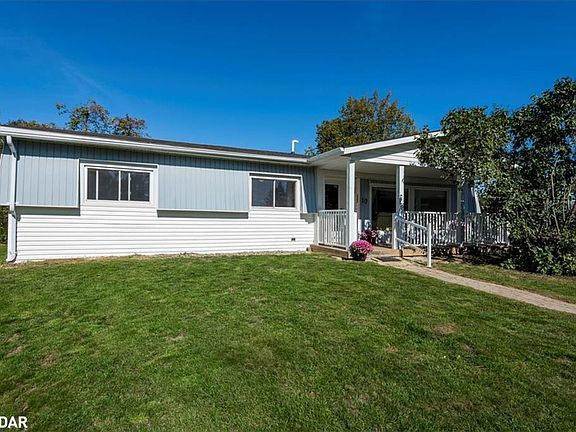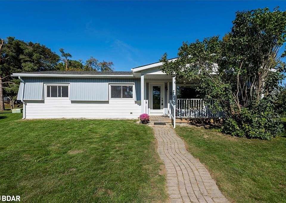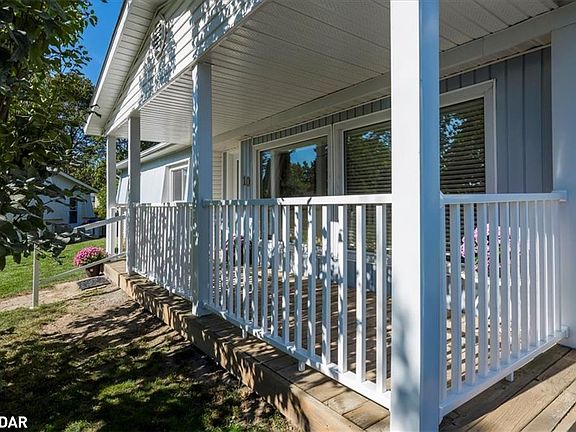 Great retirement living in the largest landlease community in Ontario and just south of Barrie. Conveniences galore within minutes. A small Mall on location with a Restaurant, variety store, pharmacy, hair dresser. A lovely home with a nice layout and great for a large dining room set so you can continue all your entertaining. Living room is large with big windows to let all the light in. A galley kitchen has lots of cupboards and your laundry is at the very end of the room. There are 1 1/2 bathrooms, two bedrooms, and a Sunroom. The outside of the home has had a peaked roof installed along with the siding changed to vinyl. Enjoy your afternoon or evening sitting on the front covered porch or on the back deck. So many activities within the community, you can be as busy or as quiet as you like. On going dances, darts, billards, kareoke, bingo, two outdoor heated salt water pools and the list goes on. Golf carts allowed ! New Fees 855.00 new taxes 155.30