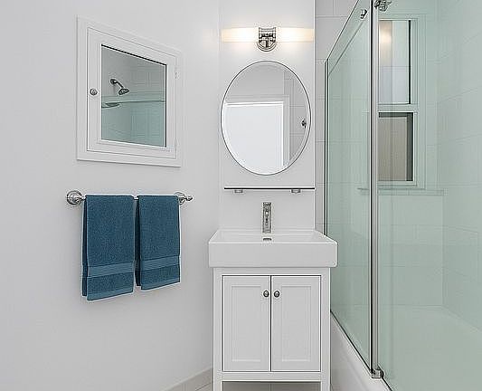 The newly appointed, windowed kitchen features custom cabinetry, Spanish terracotta-toned floor tiling, and a suite of premium, integrated appliances, including a Forte Refrigerator, Bosch dishwasher, and Gaggenau stovetop. The bright, windowed bathroom boasts new Brazilian wall tiling, durable porcelain floors, a contemporary Italian sink vanity, and a new frameless, double-sliding glass shower enclosure with modern fixtures. There is also plenty of room for a walk-in closet.