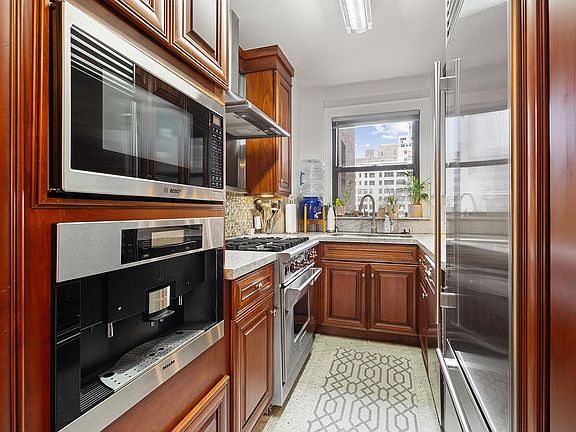 Stepping into Apartment 9-G, you’re immediately struck by the feeling of home. The sun-filled living room features high beamed ceilings and beautiful south-facing windows that frame views of the United Nations and East River. A working wood-burning fireplace adds the perfect touch of pre-war elegance and coziness. The windowed kitchen is thoughtfully updated with premium appliances, including a built-in espresso maker, custom wood cabinetry, and granite countertops. The windowed bathroom features a modern stall shower and quality finishes throughout.
