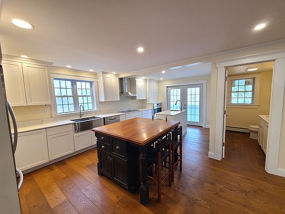 Completely renovated 4 bedroom 3.5 bath cape on a beautiful 7 acre corner lot in Greenfield. Nothing has been over looked in this renovation. New roof, siding, windows, boiler, water heater, and septic system! Open concept kitchen / living room with custom cabinets, quartz countertops, hardwood floors and grand fireplace. Generously sized primary bedrooms on both first and second floors, each with full bathrooms featuring walk-in showers. All bathrooms are upgraded with tile floors and showers. Lots of space throughout this home to spread out and make your own. Large front farmers porch and additional covered porch off kitchen. Mudroom entry area to store all the coats and shoes. Showings begin Sunday November 12th at 11 am open house.
