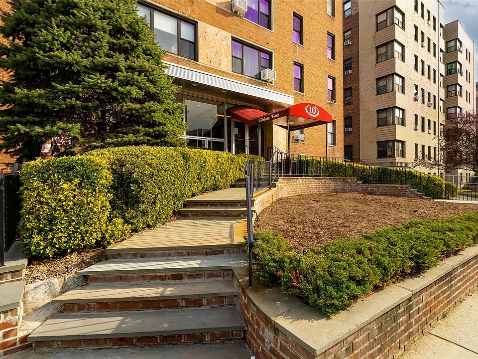 The home features a generous living room, dining area, hardwood floors, and large windows that fill the space with natural light. The updated kitchen has stainless steel appliances while multiple closets provide ample storage. This well-maintained cooperative offers amenities including a live-in super, laundry, and indoor and outdoor parking options with immediate 24-hour covered city parking available across the street.