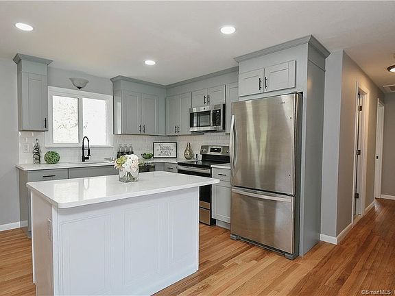 Updated Ranch with desirable open layout delivering first floor living at its finest! Fully renovated kitchen with modern cabinets, quartz counter top and new stainless steel appliances. This home features 3 bedrooms, 2 full baths and convenient carport. Bright and open living room boasting in natural light. Two updated baths, fresh paint and gleaming hardwood floors throughout. Ideal basement for many storage options. Enclosed sun-porch with private backyard. Only steps away from neighborhood pond and short drive to Rocky Neck State Park.