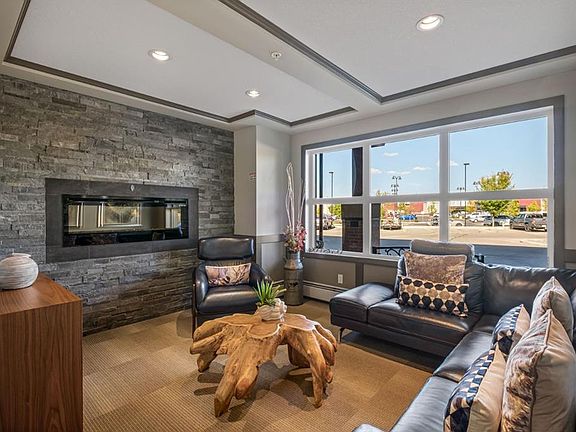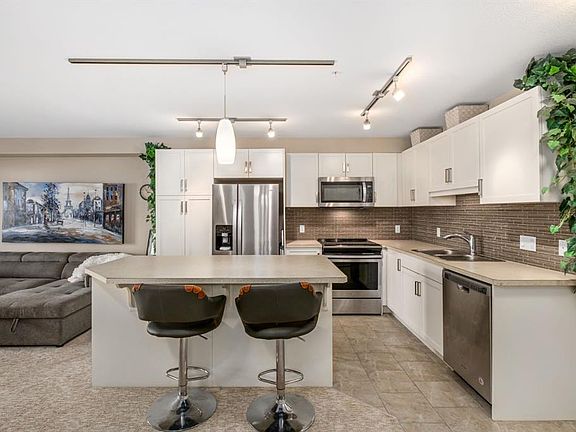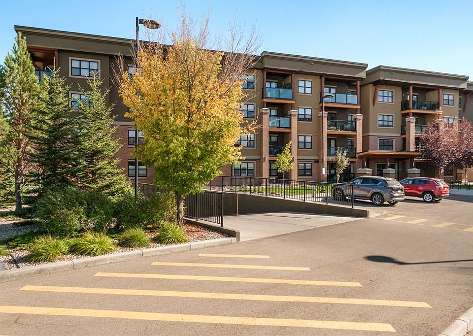 Modern open-concept layout, Stylish - quiet +40 condo community - Main floor unit - Easy access! - Ceramic in-floor heating - In-suite air conditioning - One-owner home, well maintained - Updated kitchen with upgraded backsplash & under-cabinet lighting - Large kitchen island, ideal for entertaining - Over-the-range microwave - Pantry with roll-out shelves Quiet, soft-closing cupboard doors and drawers - Spacious bedroom with dual closets - Blackout window coverings plus curtains for comfort & privacy - Bathroom with walk-in shower & built-in shelving - Cozy carpet in bedroom/living areas - Two titled parking stalls: One directly outside deck door — ideal for groceries & easy access. One secure underground stall with extra storage, located right across from stair access - Elevator access for convenience to underground parking, Perfect for couples with two vehicles or a single person with one vehicle and extra parking for family or guests parking beyond 24 hours - Small pets allowed - Barbecue gazebo for outdoor gatherings - Community turf grass area for pets - Card game days in the amenity room - Free amenities room & landscaped private courtyard - No-smoking - Steps to Kingsview Market (groceries, dining, pharmacy, medical) - Close to parks, ponds & amphitheatre - Easy access to Genesis Place recreation complex - Quick commute to Calgary via Highway 2 & Yankee Valley Blvd. Better check this amazing unit out today!