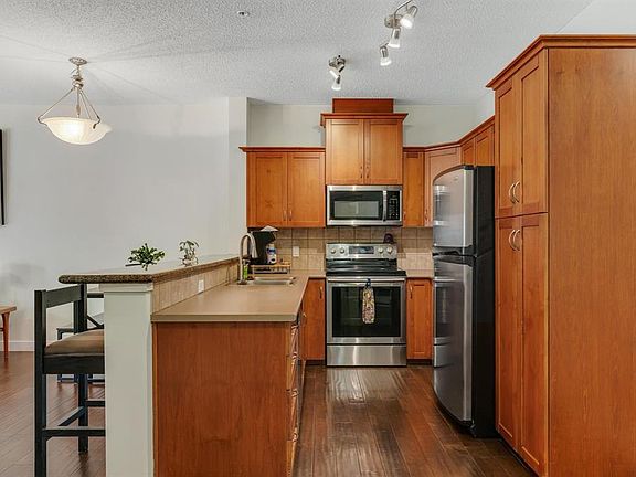 Welcome to your new sanctuary in the heart of Discovery Ridge! It’s hard to believe you’re still in the city when you’re surrounded by the tranquility of Griffith Woods. This beautifully appointed one bedroom, one bathroom condo in the sought after Wedgewoods offers the perfect blend of comfort, style, and convenience. Inside, you’ll find an open concept living space filled with natural light, 9 ft ceilings, featuring warm tones and tasteful finishes throughout with hardwood floors and a soothing gas fireplace. The kitchen is both stylish and functional, with sleek stainless steel appliances, ample counter space, and a breakfast bar ideal for everyday living or hosting friends. The primary bedroom provides a peaceful retreat with generous Walk-in closet space, while the spacious bathroom showcases contemporary fixtures and a soothing palette. Additional highlights include in suite laundry, great storage, and a titled parking stall. Step out onto your private balcony to enjoy serene sunny NW views perfect for your morning coffee or evening relaxation. Life at the Wedgewoods extends beyond your door with access to a fitness centre and social room on the main floor. The pet friendly building (with board approval) makes it a great fit for animal lovers. Best of all, your condo fees include all utilities even electricity! Set in the desirable community of Discovery Ridge, you’ll love being just steps from the endless pathways of Griffith Woods Park, while still enjoying quick access to major roadways, schools, and amenities. This is more than a condo, it’s a lifestyle. Don’t miss the chance to make this lovely home yours. Schedule a showing today and experience the best of nature and city living combined!