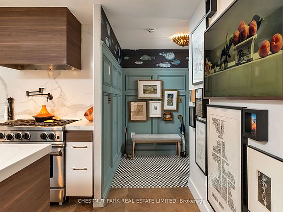 Whether you're downsizing in style or moving on up, this suite is a knockout you'll never outgrow. Welcome to Suite 709 at 10 Navy Wharf Court, a breathtaking corner unit where designer style meets unmatched functionality in the heart of downtown Toronto. This meticulously renovated suite is a showpiece for anyone who loves exceptional design, natural light, and chef-quality living. At the heart of the home is a true culinary dream: a professionally outfitted kitchen featuring a 36 Bluestar range with six open burners, a quiet Ventahood, and striking hammered copper sink including a bar sink that doubles as a champagne bucket. Custom cabinetry, hidden compartments, and sleek storage make this space both beautiful & brilliantly functional. Just behind a discreet sliding door, you'll discover a fully separate pantry complete with a wall oven, brass shelving, pan cooling racks, and a dedicated beverage fridge ideal for serious cooks or entertainers. This rare corner suite boasts floor-to-ceiling windows in every principal room, flooding the space with natural light from the north, east & south. Whether you're relaxing in the living area, prepping in the kitchen, or waking up in the serene primary suite, you'll enjoy stunning city, lake, and skyline views from every angle. Step outside to a sweet private terrace perfect for lounging with morning coffee or evening drinks under the dazzling skyline while watching planes come and go from Billy Bishop Airport. Every detail of this suite exudes high-end design, from the chevron oak flooring, concrete ceilings, to the bold curated finishes. Top-of-the-line appliances and an undeniable sense of flair make this home stand out in every way. Complete with parking, storage, and access to the exclusive 30,000 sq. ft. Super Club, including a gym, pool, tennis courts, and more. Suite 709 is the ultimate blend of luxury, lifestyle, and location. Don't miss your chance to own one of the most stylish and light-filled suites in Toronto.