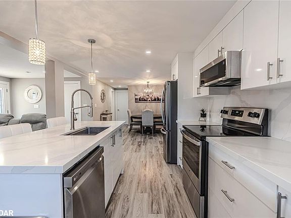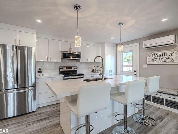 FULLY RENOVATED BUNGALOW IN AN EXCEPTIONAL ADULT LIFESTYLE COMMUNITY WITH RESORT AMENITIES AT YOUR DOORSTEP! Start your day at 10 Nettles Cove with coffee on the updated covered front porch, a leisurely walk to one of the two pools for a morning swim, and plans for an afternoon filled with friends, laughter and everything this adult lifestyle community has to offer. An on-site mall gives you a drugstore, cafe, variety store, salon, clothing shop and foot-care clinic right in the neighbourhood. Three clubhouses host ballrooms, kitchens, fitness facilities, games rooms, libraries, two heated outdoor pools, laundry facilities, dart boards, indoor/outdoor shuffleboard, indoor/outdoor pickleball, trails, garden plots and a woodworking shop, along with a full calendar of clubs, theatre, dances, card nights and social events. Just 10 mins to South Barrie’s shopping and GO Station and 15 mins to Innisfil Beach Park, this renovated one-level home is designed for low-maintenance, worry-free living. The navy blue exterior with crisp white shutters, updated covered front porch, newer rear deck, custom-built shed and two newer storm doors sets a polished tone. The open-concept layout features neutral paint tones, tasteful finishes throughout, California shutters, pot lights, and updated flooring. The kitchen impresses with stainless steel appliances, white cabinetry, a large island with pendant lighting and quartz countertops that extend up the wall as backsplash. Three well-sized bedrooms include two with custom closets and built-in cabinetry, and a third with built-in cabinetry and a clothing rod. A versatile den/office and two updated 4-pc bathrooms, including one with a dual vanity and large glass-walled tiled shower, complete the layout. Updated insulation keeps things comfortable year-round, while the driveway is scheduled to be re-surfaced this fall, making this meticulously maintained #HomeToStay a standout for those ready to live their golden years to the fullest.