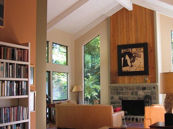 Midcentury California contemporary, three master suites, five skylights, two solar tubes, brown shingle exterior, flooded with sunlight both floors, much custom tile work. Neighborhood Description Planned community in small forested valley with central park bordering creek. Surrounded by dedicated open space and hiking trails. Architecture controlled -- mid-century California contemporary style. Little residential turnover. Equidistant from downtown San Rafael and downtown Novato. Neighborhood-owned tennis courts. All fifteen houses on street on minimum half-acre lots, traffic free neighborhood, all neighbors know one another and are friendly, three neighborhood parties each year, few cars park on street, very quiet area, wires all underground, all houses finished in natural wood tones, all yards immaculate gardens, creeks through neighborhood. Neighborhood is 25 minutes by car north of San Francisco (Golden Gate Bridge) and 12 minutes south of Sonoma Valley wine country.