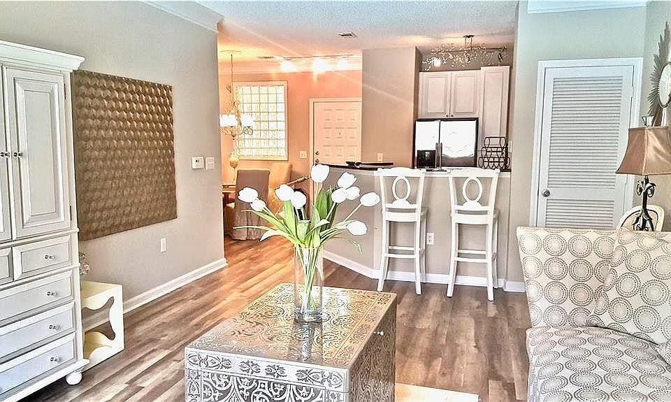 POOL VIEW + Location, Location, Location!!! Next To Villa Christina. Furnished condo on the POOLSIDE. 2nd FLOOR INTERIOR unit for added security, and satellite police office on site. Beautiful unit overlooking the pool in coveted Building 4. Complex is filled with exotic foliage...feels like a resort!! LUXURY VINYL FLOORING THROUGHOUT, GRANITE COUNTERS, SS APPLIANCES. Furniture, Iron, Ironing Board, coffeemaker, pots/pans, dishes, silverware,WASHER & DRYER are INCLUDED!! Resort style amenties are AMAZING, and include Billiards Room, Theater Room, WALKING TRAILS, Fountain, Gym, Clubroom, Social Activities, Food Trucks in good weather, Zen Areas. pet walking areas. TENANT OCCUPIED till Dec !st. Owner is a licensed agent.