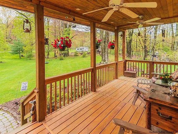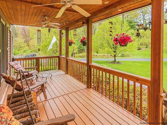 Dutch colonial on 5 private acres offers country living with all the amenities inside and out - beamed ceilings, stone fireplace, wood floors, pond, woods and lawn - plus easy access to Minnewaska State Park and Mohonk Preserve. Living room with fireplace and French doors to rear deck; kitchen has large island for ample prep area; dining room with built in fish tank (fish not included!); family room with wood stove, full bath, laundry room and additional access to rear deck complete the first floor. Second floor has the master bedroom with attached bath (including double vanity, jetted tub and separate shower); two additional bedrooms and a full bath (also with double vanity, jetted tub and separate shower). Deck with pergola almost the full width of the house offers space for entertaining and enjoying the fresh air. Hot tub added in 2020 will remain is on its own section of deck. Yard is fenced and connects to small barn (with water and electric heat) and chicken coop. Two-car garage accessed from unfinished basement which has 10' ceilings and the utilities.