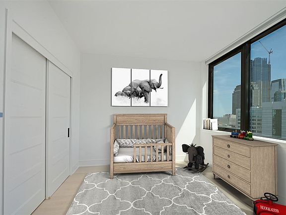Just reduced! Lowest price per sqft in the building! The only unit available of it's kind! 2 bedrooms, 1.5 bath home with floor to ceiling windows and bright SOUTHERN exposure with NYC and river views. (2nd bedroom has large closet but no window). New motorized Hunter Douglas window shades included ($7500 value). One of the largest living/dining areas offered in the newest construction building by Toll Brothers. Conveniently located two blocks from the GROVE STREET PATH station and offers an astonishing array of world-class amenities. Rooftop pool, Private Residents Lounge, 24 hr. Concierge, Beautifully Landscaped Rooftop Gardens, Sundecks and Courtyards featuring an Open-Air Fireplace & BBQs, Fitness Centers & Yoga Room and Children's playroom. Parking available for rent or purchase. *some photos are virtually staged
