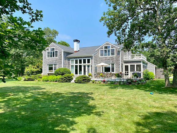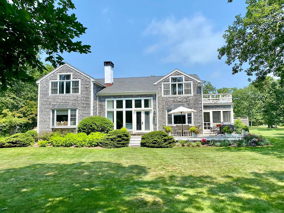 Properties rarely come to market in this special location, enjoy the peace and serenity in this the Oyster Pond neighborhood. Built in 1988, the home sits on 8 acres, abutting the state forest. Several updates throughout including a new kitchen, new roof and central AC, This contemporary 4 bedroom / 4 bath home is flooded with natural light with floor to ceiling windows, vaulted ceilings and a gas fireplace. The gourmet kitchen features top of the line stainless appliances, marble countertops, a breakfast bar, and an adjacent dining area. There is a spacious den, which can double as a home office, a first-floor guest room and a full hallway bathroom. The second floor overlooks the floor below and features 3 bedrooms with en-suite baths. The primary bedroom at the end of hall has a private, sunporch that overlooks the expansive lawn. The screened porch, deck, and outdoor shower add to the list of features. Great opportunity for a guest house, pool, or tennis court with approvals. Only 500 yards away is the Association access to the 208-acre Pond. This is one of the few properties that has deeded rights to the barrier beach offering sought-after private beach access.