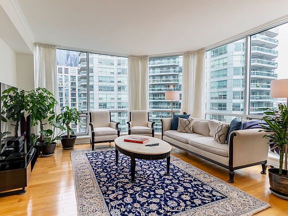 Welcome to Penthouse Living on Torontos Waterfront! This stunningly 2-bedroom suite at 10 Queens Quay W offers approx. 1,450 sq.ft. of luxury living plus a 100 sq.ft. balcony with breathtaking N, E & SE views of lake Ontario and the Toronto Skyline. Enjoy soaring 9 ft ceilings, floor-to-ceiling windows, and timeless finishes throughout. The gourmet kitchen features top-quality stainless steel appliances, granite & marble counters, and elegant porcelain floors. The spa-inspired primary ensuite boasts heated marble floors, double sinks, a soaker tub, and separate glass shower. Just steps to the Harbourfront boardwalk, waterfront dining, Union Station, Scotiabank Arena, Financial District, and ferries to Toronto Island. An exceptional opportunity to live, work & play by Lake Ontario! Maintenance fees include all utilities (building insurance, internet, TV, heat, water, air conditioning, electricity), concierge/security, locker, and full gym/fitness centre with a golf simulator. Optional in-unit security service is available for an additional fee. Second parking pad available for purchase separately.