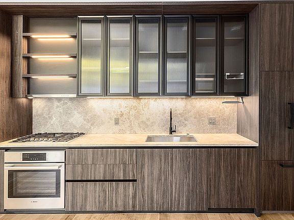 The open kitchen is a centerpiece of design and function, featuring Grigio anthracite cabinetry with fluted glass detailing, tundra gray honed quartzite countertops, and custom millwork that nods to the building’s industrial past. Premium appliances include a Bosch cooktop and oven and a Fisher & Paykel refrigerator.