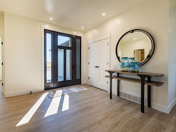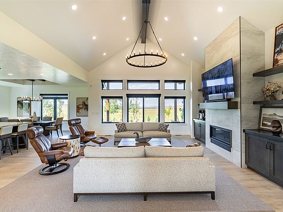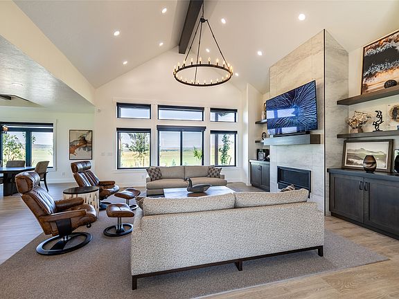 This premium Silver Stone Homes build offers over 5,000 sq ft of exceptional craftsmanship in the highly sought-after Foothills subdivision, known for its country feel, open space, and beautiful mountain views—all just minutes from town and the rapidly developing East End of Great Falls. This brand-new 5 bedroom, 4.5 bath, 3-car garage home features an impressive open-concept design. The gourmet kitchen includes a large island, walk-in pantry, quartz countertops, a spacious dining area with coffered ceilings, and commercial stainless steel appliances. The main living area is flooded with natural light and highlights vaulted ceilings, a floor-to-ceiling stone fireplace, and expansive windows that capture the scenery. The main floor includes a luxurious primary suite with a walk-in tile shower, free-standing tub, double vanity, and a large walk-in closet. You’ll also find a drop zone with cubbies off the garage, main-floor laundry, an additional bedroom/office, and a half bath for guests The 9’ ceiling basement offers incredible space with a second primary suite, two additional bedrooms that share a full bath, a storage room for décor and luggage, and a large family/rec area for entertaining. The bonus room above the garage serves as a potential third primary suite, complete with a full bath and a private deck perfect for enjoying morning mountain views. This versatile space could also be used as a gym, office, library, or theater. Other upgrades include on-demand hot water, gas forced air, and Silver Stone’s signature quality finish work. Exterior details feature rough-sawn Douglas Fir beams, a welcoming front porch, and a large covered back patio.