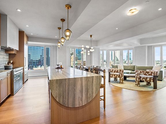 Fully renovated residence at Rowes Wharf offering spectacular views overlooking the Rose Kennedy Greenway, the Financial District and Boston Harbor. Rowes Wharf is home to Boston Harbor Hotel, a Forbes 5-Star and AAA diamond waterfront hotel that offers residents a white-glove living experience second to none. The open plan living, kitchen and dining room features white oak flooring, bespoke built-ins, and floor-to-ceiling windows providing panoramic views. The gourmet kitchen is equipped with custom oak cabinetry, ocean blue travertine countertops, and top-of-the-line appliances. The expansive primary suite is complete with a designer dressing room and lavish marble bath. Additional features include new HVAC, real travertine everywhere and Dornbracht fixtures. In addition to hotel services, amenities include 24-hr concierge, doorman and a new Health Club, now open after $7 million renovation. Steps from the vibrant Greenway and high-end restaurants, shops and hotels. 1 garage parking.