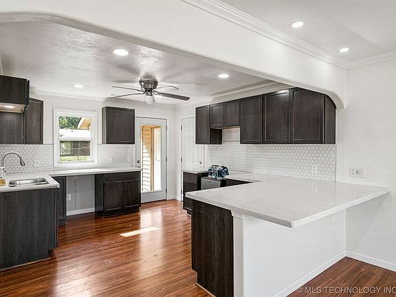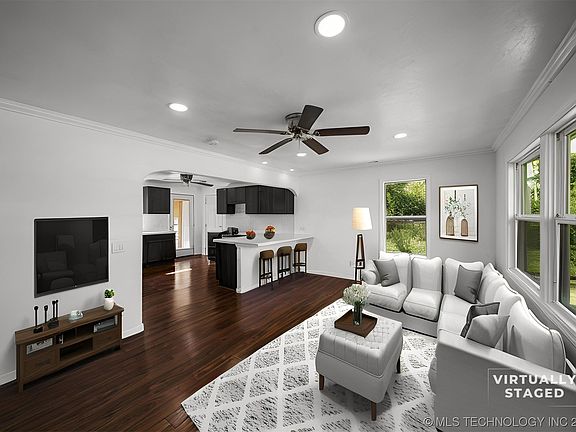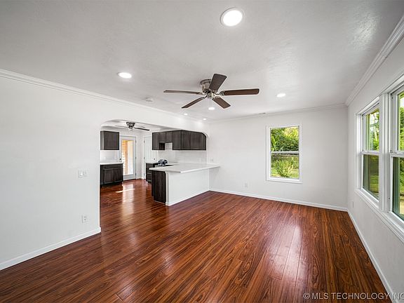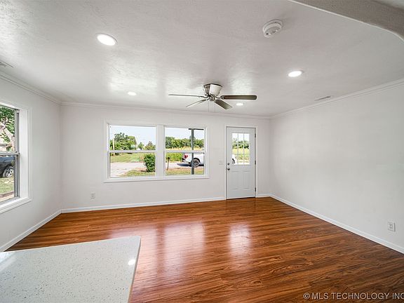 Totally updated Home in Town For Sale in Pryor City Limits. This charming 2 bedroom, 1 bath bungalow has been totally renovated and ready for you to call home. The living room wall was opened up so you can enjoy the open floor plan in the kitchen and living room. Kitchen has been totally updated with brand new cabinets, quartz countertops and new backsplash. New HVAC, plumbing, electrical, water and gas lines are a plus. The NEW bathroom features a beautiful tiled tub/shower, new fixtures, new vanity and floors. Don't miss the new windows, doors, flooring, lighting, fans, trim, paint and new crown molding added. Roof is 2 years old with new paint on the outside trim. This home is ready for you to call HOME. Great location and priced to sell. Let's go look !!!