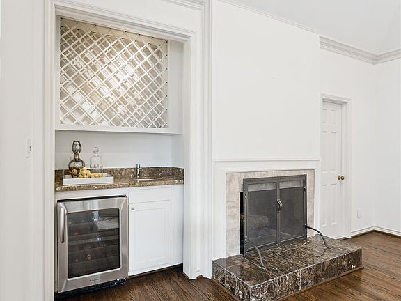 Features include a first-floor primary suite, soaring double-height living room with fireplace, wine bar, and oak hardwood flooring. A second primary suite upstairs mirrors the first, each with dual baths, walk-in closets, and private showers. A third bedroom with bath opens to a large deck overlooking majestic oak trees.