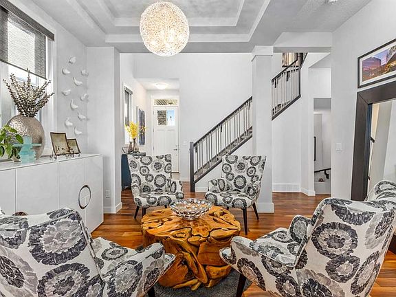 ** OPEN HOUSE SUNDAY OCTOBER 5TH 12-3PM** From the moment you step inside, this stunning home feels like something out of a Pinterest board or a high-end interior design magazine. Every detail has been thoughtfully selected & expertly executed, making it a true showstopper that shows 10 out of 10. Located in the prestigious community of Riverstone in Cranston, this 2,500 sq ft two-storey home offers an unbeatable lifestyle—backing directly onto a tranquil natural reserve & fronting onto a kid-friendly playground. It’s the ideal combination of luxury, functionality, & location. Inside, you’re greeted by 10' ceilings, acacia hardwood floors, & a layout that flows effortlessly. The front dining room features a double tray ceiling & a striking designer light fixture, while the expansive rear living room is anchored by a gas fireplace wrapped in marble-style tile with a lower hearth. Large windows along the back wall frame serene views of the green space beyond, bringing the outdoors in. The chef’s kitchen is a showpiece—featuring full-height dark-stained cabinetry with bar pulls, white quartz counters, upgraded appliances, & a stunning herringbone tile backsplash that extends to the ceiling around the hood fan. A cabinet-style pantry wraps into a coffee bar nook for added function & flair. The back mudroom connects seamlessly to the oversized garage & includes locker-style built-ins. A beautifully wallpapered 2-piece powder room adds a touch of charm. Upstairs, the large bonus room is wrapped in modern railing & showcases a birch forest wallpaper feature wall, built-in ceiling speakers, & laminate floors that continue throughout the upper level (carpet only on the stairs). A convenient built-in desk area outside the kids’ bedrooms creates a perfect zone for homework or study sessions, while a built-in bench at the top of the stairs offers a cozy reading nook. All three bedrooms include custom California Closet-style built-ins for thoughtful storage. The primary suite overlooks the peaceful reserve & features a spa-like ensuite with a large soaker tub framed by a picture window, a massive glass shower, dual sinks with a dedicated vanity space, & a barn-style door leading to the generous walk-in closet. The professionally finished basement, completed by the builder, extends the living space with durable laminate floors, a spacious rec room, a bright fourth bedroom with a wallpaper feature wall, a 4-piece bathroom, & a sleek wet bar complete with sink & mini fridge—ideal for entertaining or relaxing movie nights. Step outside to discover your private oasis. The beautifully landscaped backyard is designed for both comfort & calm, with mature trees providing privacy & a two-tiered deck perfect for hosting or unwinding. A cozy hot tub area invites you to relax year-round, while thoughtful details like under-deck storage and low-maintenance landscaping enhance the functionality.