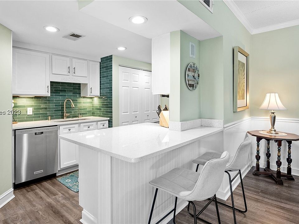 PERFECTION NEAR THE BEACH! New to market! This island-style villa is not only wonderfully renovated, it is close to the beach and next to Celebration Park, a prime spot for festivals and island-sponsored events. This is THE PLACE TO BE on HHI! A preferred first-floor villa, so no need to jump on/off the elevator! Updated with LVP floors, recessed LEDs, quartz counters, stainless steel appliances, glass tile accents, shiplap, custom cabinets & closets, current color selections, stylish baths, elevated balcony, etc.! The regime is well-managed and the complex is pet-friendly for owners. No rental restrictions, so let the income offset costs.