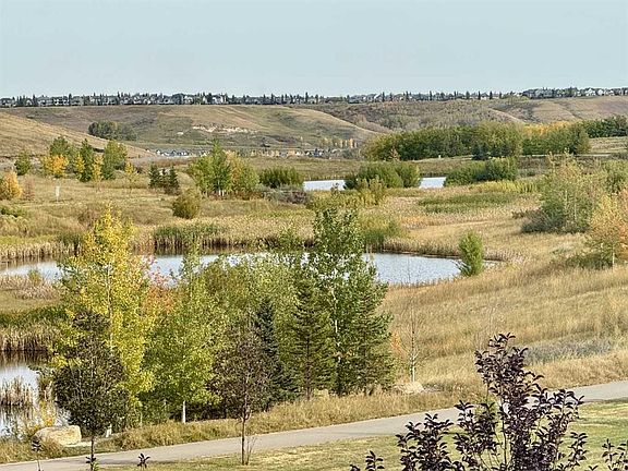 Large 3-bed 3-bath END UNIT siding on the PARK, PONDS and RIDGE in this quiet Walden cul-de-sac, with expansive, breathtaking views of the Walden walking loop, Bow River Valley and Cranston Ridge. This professionally designed 3-level home features a 14-foot vaulted ceiling in the primary bedroom, as well as 11-foot ceilings in the secondary bedrooms and living room. Oversized windows with south, north and east exposure illuminate the home with a bright and spacious feel. Upgrades include white Hunter Douglas blinds throughout, modern tiled flooring in the entrances and kitchen, high ceilings on each level, a vaulted window in the primary bedroom, custom-designed wallpaper, Bjornson wood kitchen and bathroom cabinetry, a center island in the kitchen and stainless-steel Whirlpool appliances. A south balcony off the kitchen and a large patio at the front enhance outdoor living. Both upper floor bathrooms have full bathtubs and showers. The lower level is a fully finished, drywalled and painted garage with an attached, beautifully finished studio flex space for a home gym or office. Heavy and secure entrance doors offer windows for added light and large closets with convenient shelving. Professional landscaping and snow removal is done for you! Convenient access to amenities in the Walden and Legacy shopping plazas, all connected via paved walking paths.