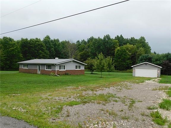 Great country location with wooded lot to the rear. Additional detached garage 21x33 w/extra room 18x21--can be an office, storage, or for fun. (Heated). Attached garage has a full bath and laundry area. Oak kitchen. Updated bath. Large bedrooms & LR. If you enjoy garage space and one story living, THIS IS IT!! Look no further! Reznor propane heater in detached garage.
