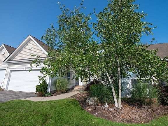 OPEN HOUSE CANCELLED. OFFER ACCEPTED. Wonderfully maintained townhouse in highly sought-after Spyglass Landing (55+)! Enter the 2 story foyer and you will feel right at home! The great room is bright & airy w/cathedral ceiling, large windows w/pleasing views & gas fireplace. Sparkling hardwood floors, crown molding, wainscoting, eat-in kitchen, formal dining room. White cabinet kitchen w/pantry closet opens to both dining areas. Slider to private deck overlooking lush secluded landscape. Large 1st floor primary suite w/spacious walk-in closet features private bath w/double vanity, large tub, separate walk-in shower & toilet area. Half bath, convenient laundry room & access to attached 2 car garage round out the 1st floor. Absolutely perfect for one level living! Open staircase leads to upper level offering 2nd bedroom w/ceiling fan, a full bath & comfortable loft area that allows versatility as den/office/sitting area. Enormous potential in unfinished walk out basement.
