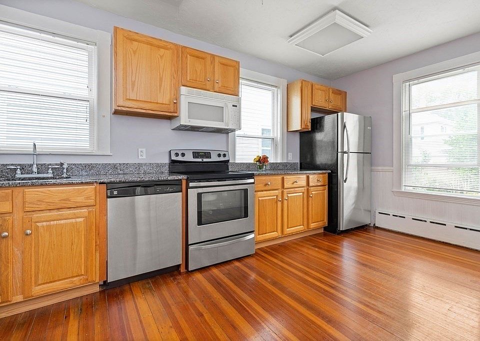 This first floor two bedroom condominium offers a large eat-in kitchen with stainless steel appliances and granite counter tops. There is plenty of storage in the kitchen and room to add a table. The spacious living room offers a flexible floor plan to create a dining are or home office. Each of the bedrooms has a good size closet and the full bathroom is tiled with a tub and shower. Other features of this home are the wood floors, original moldings and doors and plenty of windows throughout. This home features one car deeded parking, a deck and a professionally landscaped yard. Seconds too desirable Fisherman's Beach and Preston Beach and close distance to restaurants, shopping and public transportation. Swampscott's living at its Best !