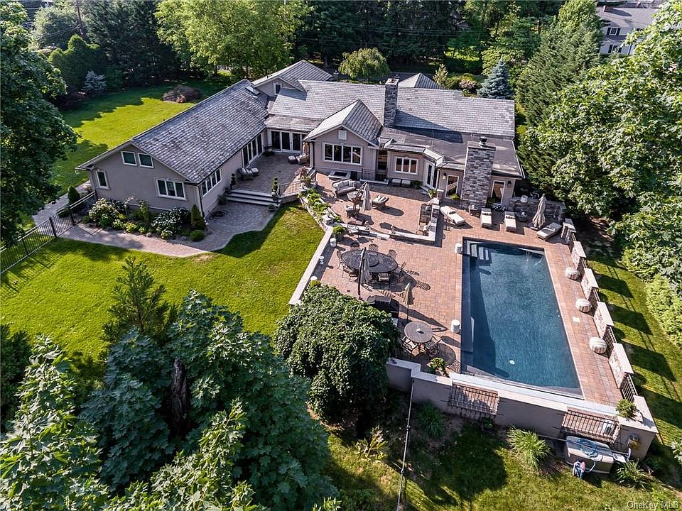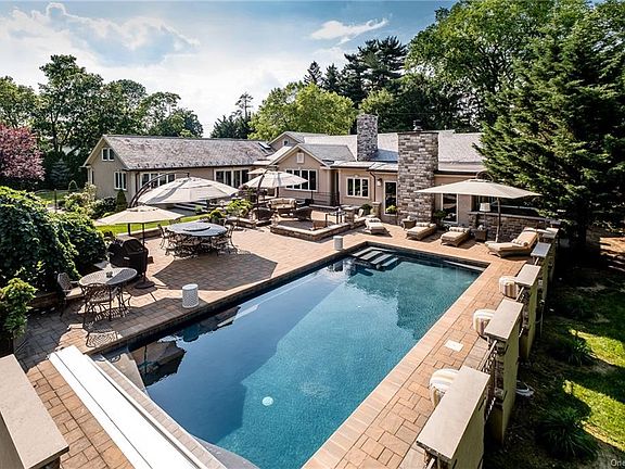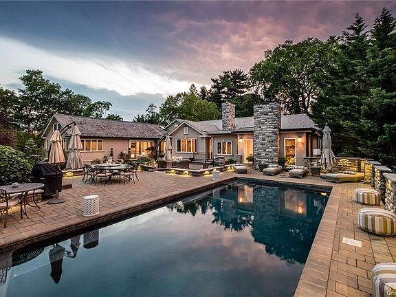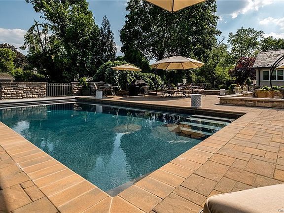 Resort-style living in the Burbs! This 5BR, 6.1 bath beauty is fabulously sited on nearly an acre of expertly landscaped grounds with 3 sun-drenched patios and a 34x15 ft Gunite saltwater pool. 4200 SF of luxurious, one-level living, myriad French doors and over-sized windows invites the outdoors in. The large main suite has cathedral vaulted ceiling, renovated bath and new custom closets. A second ensuite bedroom has been renovated with new custom closets and a home office/study space. Fireplaces are found in the living room, family room, and the lower level recreation room with adjoining exercise room. The gourmet kitchen with new granite counters and Wolf appliances is the perfect setting for epicurean delights. Other special features include new floors, several rooms with leaded glass windows, custom crown moldings and wainscoting. 4 Zone AC, slate roof, landscape lighting, 9-zone irrigation and circular drive. A long, long list of improvements.