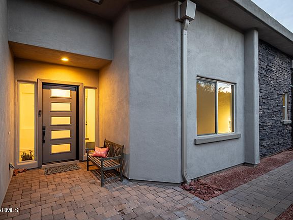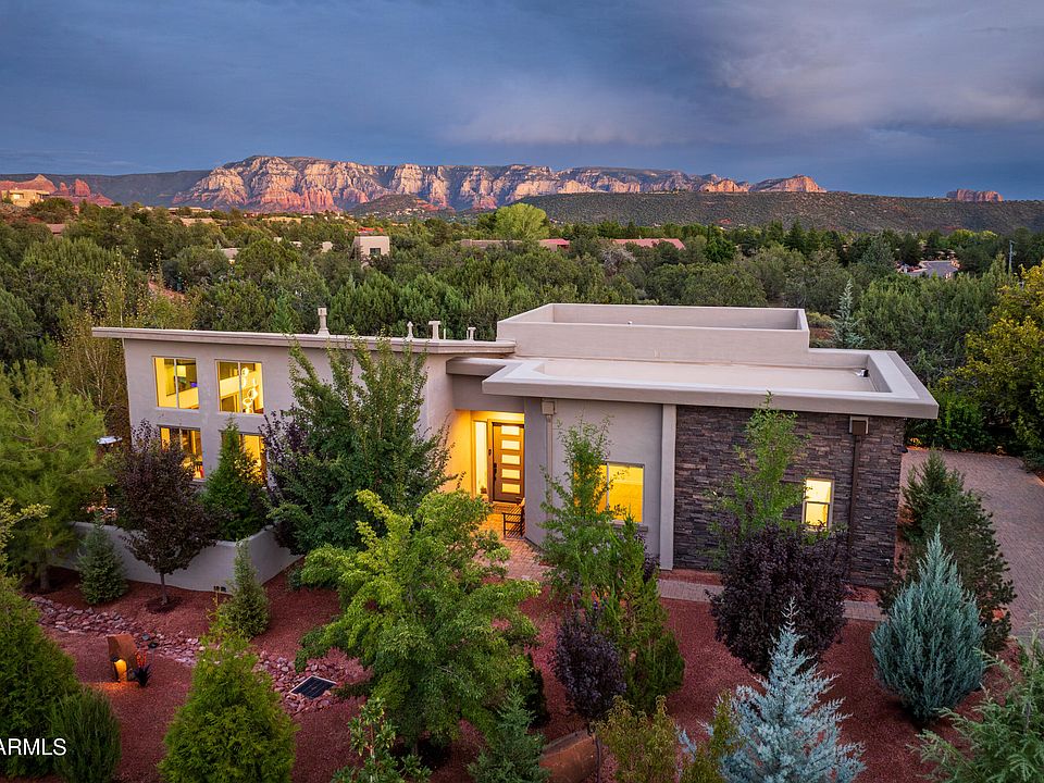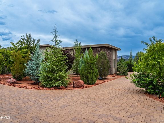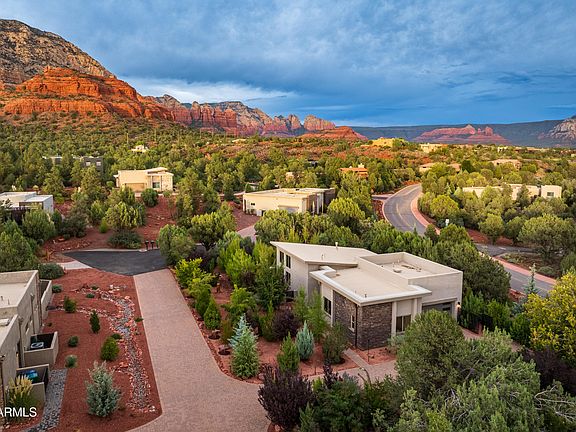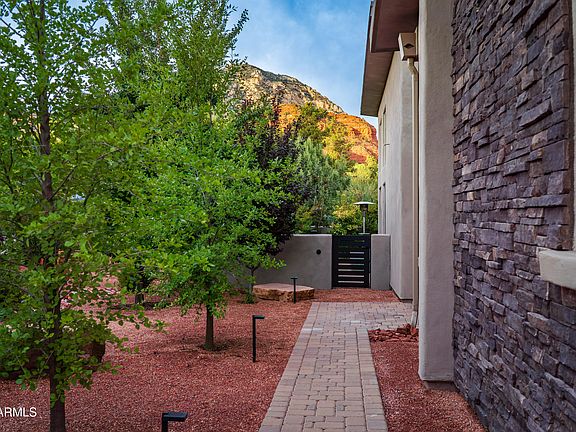 Feel away from it all while being right in the middle of all that you want from a Sedona lifestyle. Because this isn't just a home, it's a hideaway that offers fabulous views of majestic Thunder Mountain plus unique landscaping in which numerous trees, rocks and plantings are all placed to provide a cozy level of privacy. But unlike other hideaways, this one comes with fast access to local shopping, restaurants, hiking and biking trails, and more. The unique vibe continues inside where, to the left of the entrance hall, you're greeted by towering ceilings, windows that show-off the red rock views, wood-look tile floors, and a liberating open floor plan encompassing the living room and kitchen. It makes the house feel as spacious as the Thunder Mountain terrain outside. The kitchen offers a gas cooktop, stainless appliances, and tons of storage including a walk-in pantry. The living room portion of the open space walks out to a private paver patio. Just off the open area is the airy primary bedroom, featuring vaulted ceilings, plenty of natural light, a fabulous bath with a walk-in shower, and a generous walk-in closet. To the right of the entry hall there is a roomy office that can easily be an extra bedroom. Beyond that is a comfortable guest suite with a sitting area, full bath, and walk in closet. Down the hall from the guest suite are a half bath, the laundry room, and access to the two-car garage providing ample storage. The garage leads to a paver driveway with multiple parking spaces for guests. Come and tour this conveniently located hideaway.