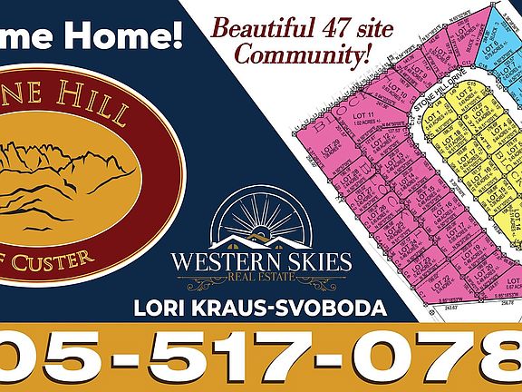 The time has finally come and the much anticipated residential building lots are now available in the Stone Hill Subdivision! 47 beautiful lots from .42 acres up to 1.06 acres available with amazing views of the Needles. Buy now and build later! These lots offer city water & sewer on site, underground electricity and fiber optics through Golden West. Now is the time to own your piece of dirt in the beautiful Black Hills. Covenants will allow modulars on certain lots with modifications and approval from the ACC. No modulars allowed on lots off Park Ave. List price of lots are NOT negotiable Listed with Lori Svoboda @ Western Skies Real Estate in Custer 605+517--0785