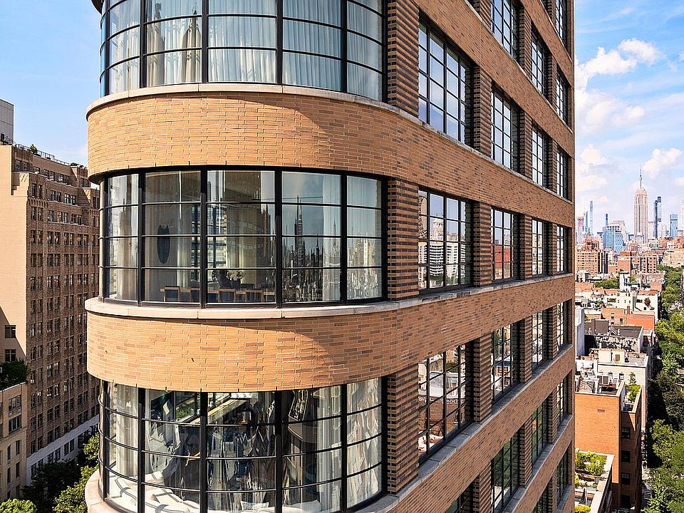 The primary suite is positioned for optimal privacy, complete with a huge sunlit dressing room and a spa-like marble bath featuring a freestanding soaking tub, oversized steam shower, radiant heated floors, and Macassar Ebony double vanity with Lefroy Brooks fixtures. North-facing windows provide stunning views stretching up to the Empire State Building.