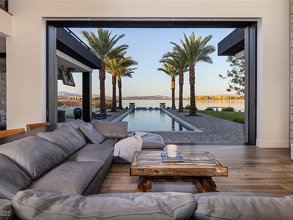 Designed by Swaback, an apprentice of Frank Lloyd Wright, this stunning lakefront home is an architectural gem on Lake Las Vegas. Wright’s philosophy of organic architecture blends clean horizontal lines, natural materials, and desert views into a seamless living experience. Floor-to-ceiling glass blur the line between indoors and outdoors, showcasing the surrounding landscape like a living art.The open-concept is thoughtfully designed for both intimate relaxation and entertaining. Interior highlights of this 12015 SF home include a climate-controlled wine display, a private office, spa-inspired bathrooms, and a chef’s kitchen with premium finishes.. Outside enjoy resort-style amenities such as a 60-foot pool, built-in BBQ, and private boat dock, all located within the exclusive guard gated community of The Estates. The property also features an oversized RV garage with split AC. This is a rare opportunity to own a modern masterpiece in one of the most prestigious settings on the Lake.