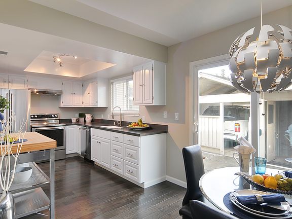 Facing a spacious greenbelt, this updated townhome in the heart of Mountain View showcases convenience and calming views. Its walk-up setting allows easy access, while refinished interiors offer style and ease. Picture windows illuminate rooms upgraded with floors of wide-plank wood, premium carpet, and fashionable tiles. Relax beside the living rooms fireplace, or unwind with family in the open-concept dining area. The crisp, remodeled kitchen provides quartz countertops, upgraded stainless appliances, and access to pantry and laundry. Upstairs are three bedrooms with cedar closets. Double doors lead to a spacious master suite with oversized walk-in closet and single-basin dual vanities. Enjoy a half bath, covered parking for two cars (including private garage), serene outdoor retreat with patio and fruit trees, and community pool. Stroll to buses, eateries, and Safeway with Starbucks. Parks, freeways, schools, tech campuses, and vibrant Downtown Mountain View are moments away!