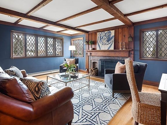 CHARMING Tudor style home w/5000+ SF of beautiful living space in a COVETED location, just a stones throw to the high school. This home underwent a MAJOR renovation/expansion in 2005, but sellers maintained the original facade and many interior details to preserve the character of the home. Fabulous OPEN Kitchen, Dining and Living rm w/a wall of windows for amazing natural light. The island seats 6 comfortably and offers cherry cabinets, high end appliances, and a butler's panty for plenty of storage. There's a cozy den w/stone fireplace, wood paneling & beams AND a beautiful, spacious family room w/custom built ins and gas FP. A "to-die-for" laundry rm, mudroom w/cubbies and FIRST floor Guest/In-law/Nanny suite complete the first floor. Upstairs there are 4 add'l bedrooms, inc. a large Primary suite w/2 walk in closets, a spa like bath and Office/Nursery. Fabulous finished LL w/half bath. Spacious, level front yard & room to create a charming Beacon Hill style back/side yard!