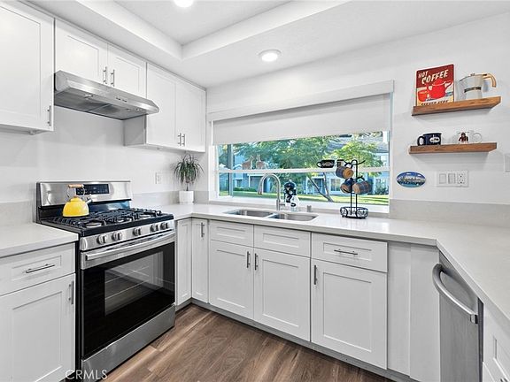 Gorgeously updated with designer touches throughout, this stunning end-unit home in the highly desirable Northwood community is a rare gem. Attention to detail, an ideal floorplan, and a park-like setting create a warm and inviting atmosphere. Enter through the private front patio and double-door entry to find a spacious living room with a cozy fireplace, perfect for fall evenings. Adjacent is the formal dining room, ideal for holiday gatherings. The beautifully remodeled kitchen boasts bright white cabinetry with upgraded hardware, quartz countertops with an expansive peninsula, stainless steel appliances, a 5-burner gas stove, and an oversized sink with serene park views from the bay window. The adjoining family room and eat-in kitchen area offer abundant natural light through a large glass slider, leading to a two-level patio and deck where friends and family can enjoy outdoor dining and BBQs. A versatile downstairs bedroom or office is great for today's modern lifestyles. There is a cleverly designed under-stair storage system is perfect for keeping organized and clutter free. Upstairs, the primary suite features soaring ceilings, dual mirrored wardrobes, a linen cabinet, and a private deck overlooking green park views. The luxurious primary bathroom includes a quartz dual sink vanity, white shaker cabinets with modern pulls, and a walk-in glass shower. Two additional bedrooms and an updated hall bathroom offer ample space for family or guests. Plantation shutters, easy-care woodgrain laminate flooring, a sleek wet bar, and custom decorative nooks throughout the home create a unique, stylish ambiance. Completing this home is a two-car garage with abundant storage. Close to award-winning schools, shopping, dining, entertainment, numerous parks, and recreational options, this home offers the best of Irvine’s lifestyle.